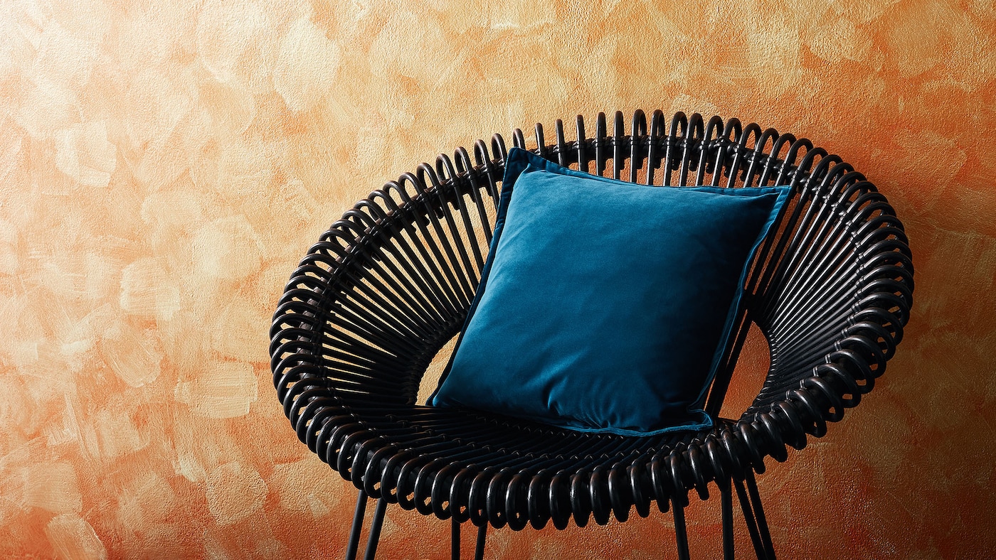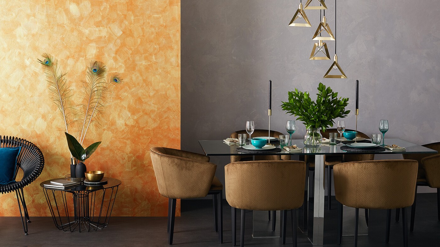 Here we chose Orange Copper for that really retro look. The paint has a special dual colour effect—when viewed from different angles, it reveals subtle shades that change with the light. This striking shade is ideal for a feature wall, which you can then balance with a cool, contemporary shade for the rest of the room.