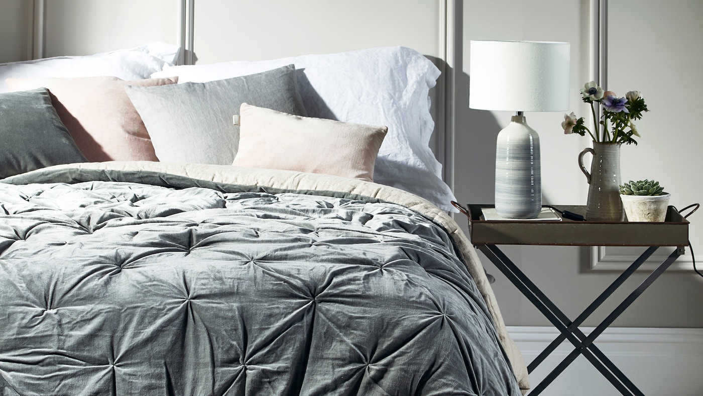 Add a luxury feel to your bedroom with a velvet quilt and neutral painted walls. Photo: Cox and Cox